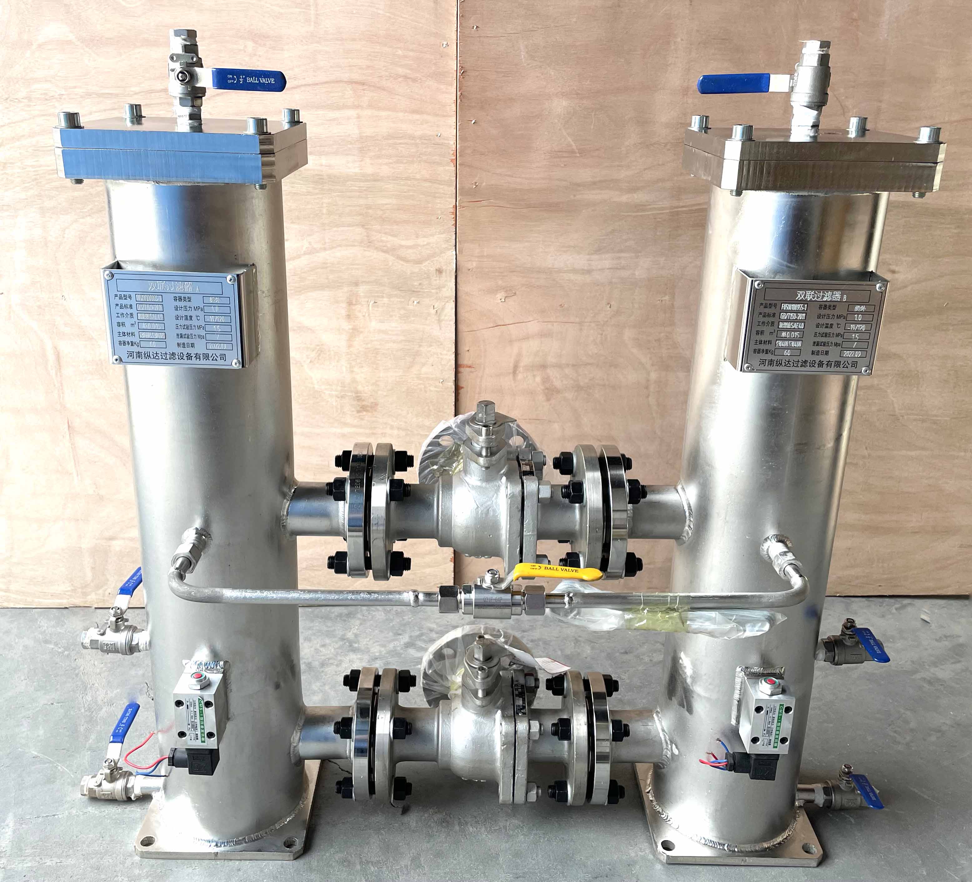 雙筒過濾器,也叫雙并聯(lián)過濾器,由兩個(gè)單筒過濾器及換向閥組成,在工作過程中,單筒過濾器濾芯堵塞需要換濾芯時(shí),可以轉(zhuǎn)動(dòng)換向閥切換到另外一個(gè)單筒過濾器繼續(xù)工作,實(shí)現(xiàn)不停機(jī)的情況下更換濾芯,保證主機(jī)正常連續(xù)工作。